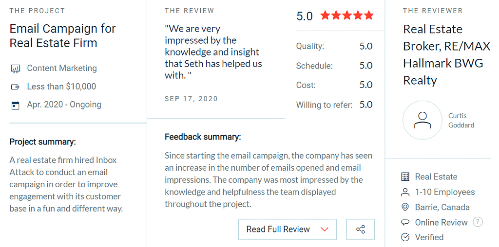 “Thanks to Clutch for recognizing Inbox Attack as a Top B2B Company for 2020. We hope our quality of service speaks for itself, but it’s always fantastic to have endorsements from industry influencers like Clutch to back us up.” – David Begg, B2B Director at Inbox Attack.